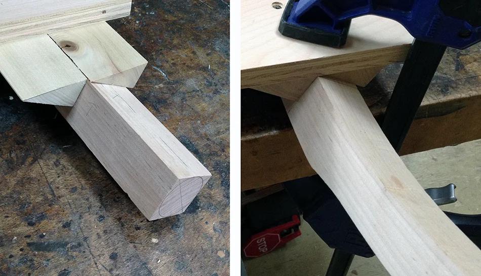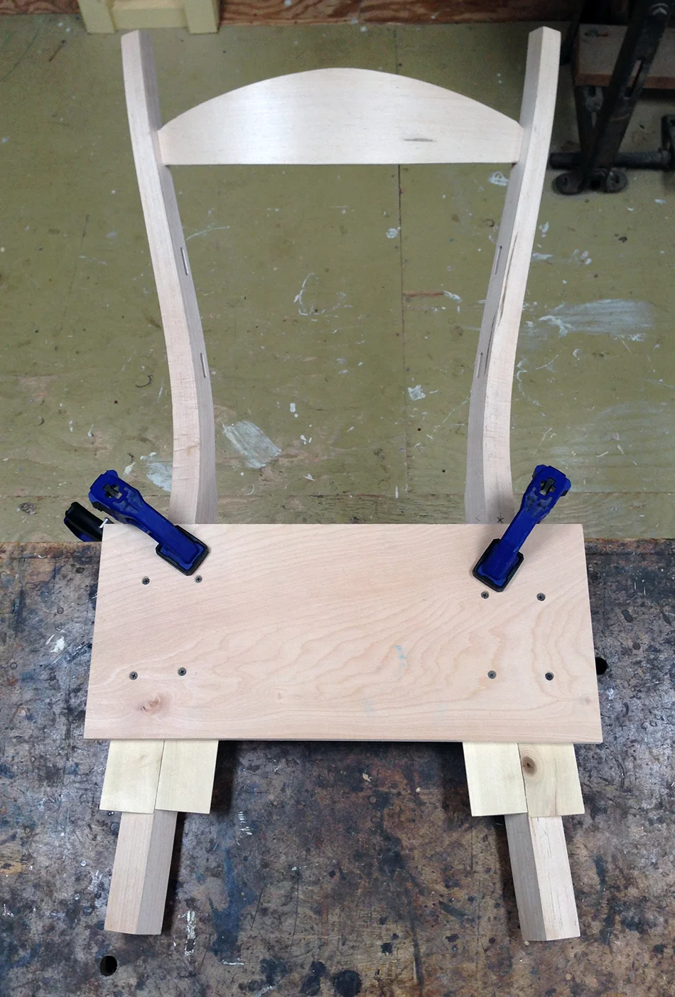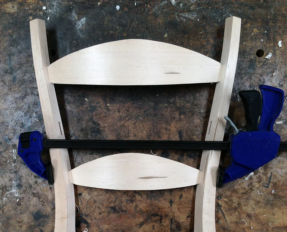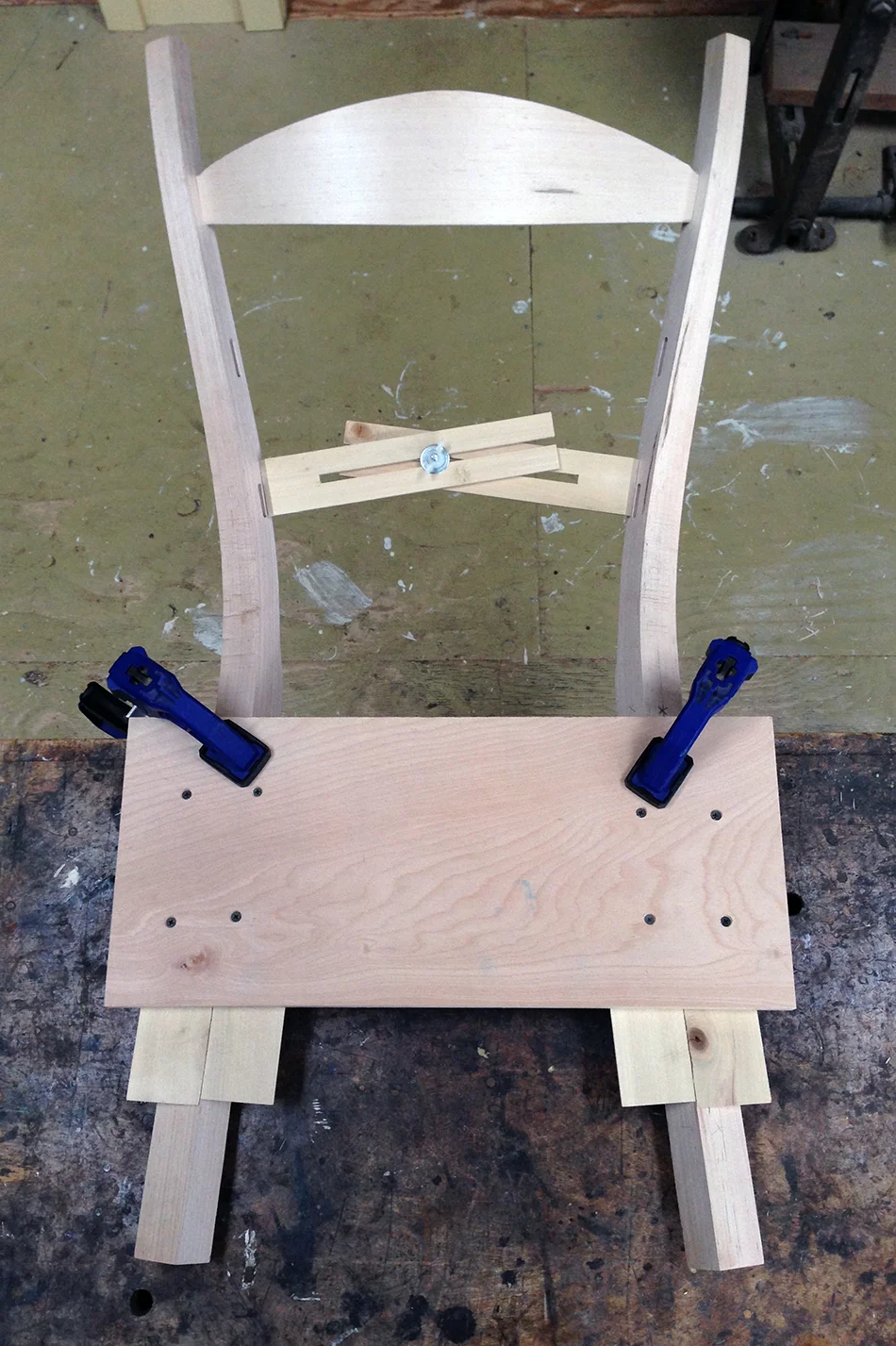 With tight fitting tenons it can sometimes be difficult to fully seat the tenons simply by squeezing the legs together. To help with this I sometimes clamp the legs in-line with the slat as shown below. I use just enough clamping pressure to bend the slat upward a little bit. Then I bang on the back of the slat with my fist until the tenon fully seats in the mortise.