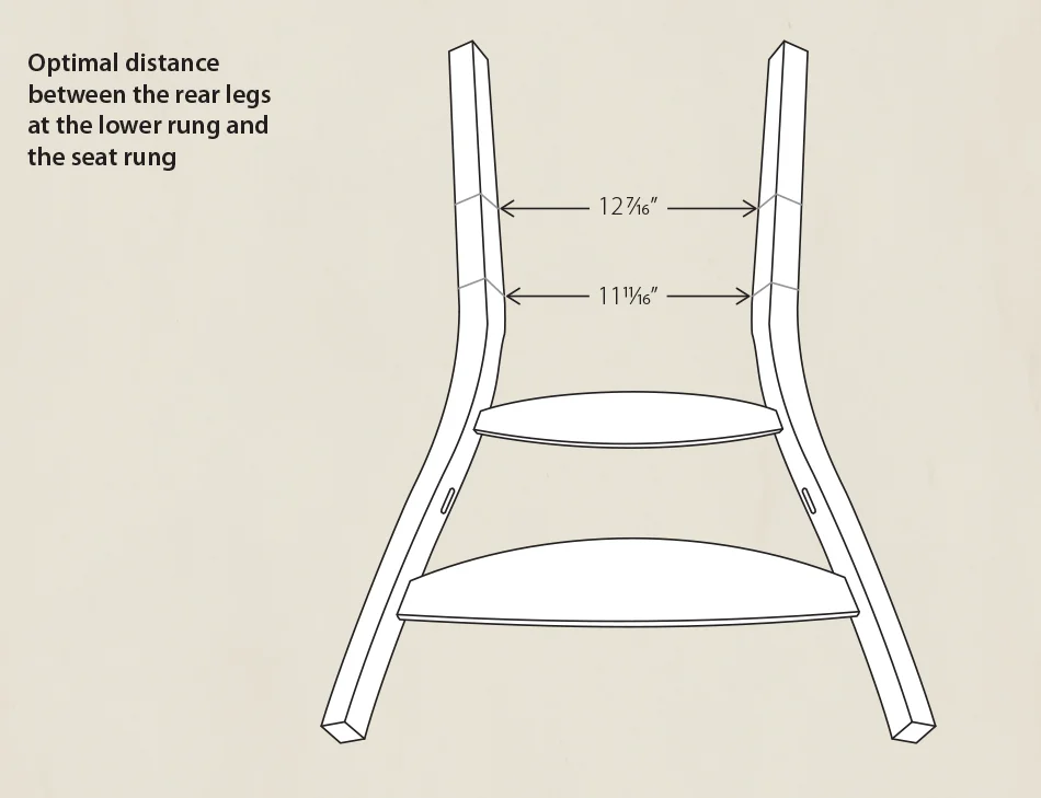 Seat rung distance is good, but the lower rung distance is too narrow. This situation does not occur very often but it can happen. It is essentially the opposite of the first problem described above where there is too much side-to-side splay between the rear legs. In this case there is too little side-to-side splay. The solution is to increase the rotation of the rear legs by increasing the angle of the slat tenons on the upper slat (and maybe the lower slat as well). I then check the measurements and continue adjusting until I am satisfied with the result — again generally to within 1/8″ of optimal.