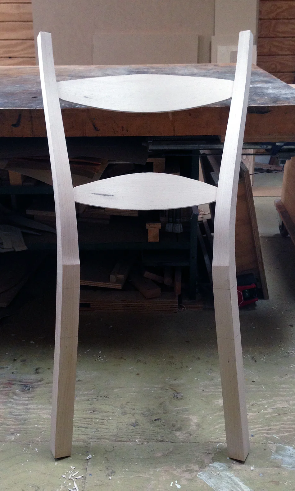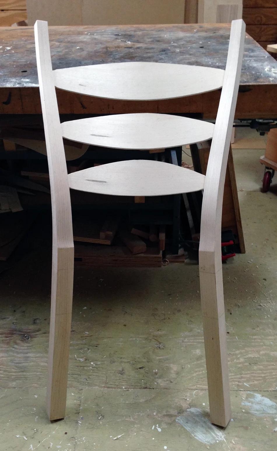 I teach how to build this chair in a six day class. Every post in the side chair build series up until now (19 posts so far, including this one) describe processes that I teach, and that the student completes, in the first two days of class. After getting to this point we move onto hand shaping — first the front legs, followed by the rear legs. After that is finish shaping the slats and turning the rungs.