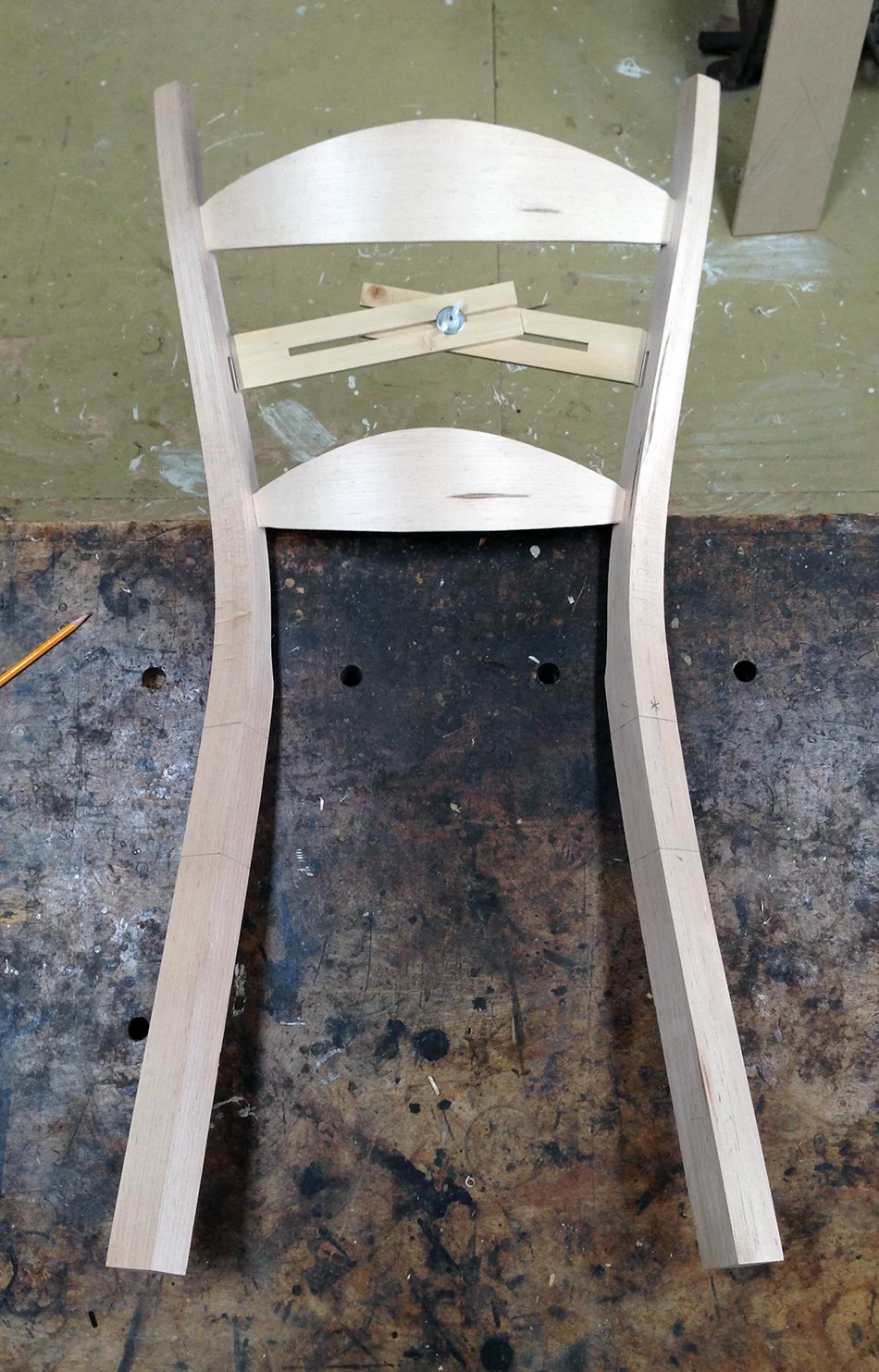Seat rung distance is good, but lower rung distance is too wide. What this means is that the side-to-side splay of the rear legs will be too great. Based on the difference in length between the seat rung and lower rung I am looking for a difference in distance between legs at each rung location of 3/4″. I often see a difference of 1″ or more. The solution is to decrease the rotation of the legs. I accomplish this by flattening the angle of the top slat (and sometimes the bottom slat as well) a couple of degrees or so. The effect of this is to bring the legs closer together, but the amount of reduction in distance varies depending on how far down the leg I am measuring. The seat rung location represents the closest distance between the two legs, so you can think of it as a pivot point with the top and bottom flaring out from there. If you make a change in rotation at the top it will affect the distance between the legs at the bottom, but it will not effect the distance at the pivot point (the seat rung location). I know this sounds complicated but it is really quite simple. You can actually see this happening by putting a clamp on the legs at the bottom rung location and applying some clamping pressure. As you do, watch the top slat — it will get flatter as the legs get closer together. You can also measure the distance between the legs at both rung locations — you should see a greater reduction in distance at the lower rung location compared to the seat rung location. I am generally satisfied if I can get the difference in distances at each rung location to within 7/8″ (or 1/8″ greater than the 3/4″ optimal difference). This extra 1/8" will easily be taken up when the legs are clamped together at assembly.