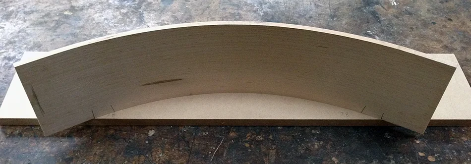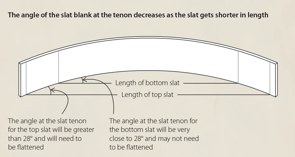 If you remember from this post, when I did this same angle check on the top slat, the angle of the slat blank was greater than 28° and needed to be flattened. The reason for this is that, as the length of the slat gets shorter, the angle of the blank at the tenon decreases as shown in the illustration below. Knowing this, when I bend the blanks, I need to make sure that the angle will be large enough for the smallest slat. Since all the blanks are bent to the same arc this means that the longer slats will have a higher angle at the tenons than is necessary and will need to be flattened.