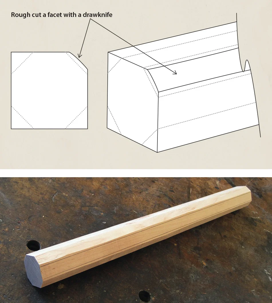 Switch to a flat bottomed spokeshave and cut shallow chamfers up to both layout lines. It’s much easier to cut to the line when making these narrow chamfer cuts as opposed to making full width cuts. The chamfers define the limit of the facet and become a reference for making the final flat facet.