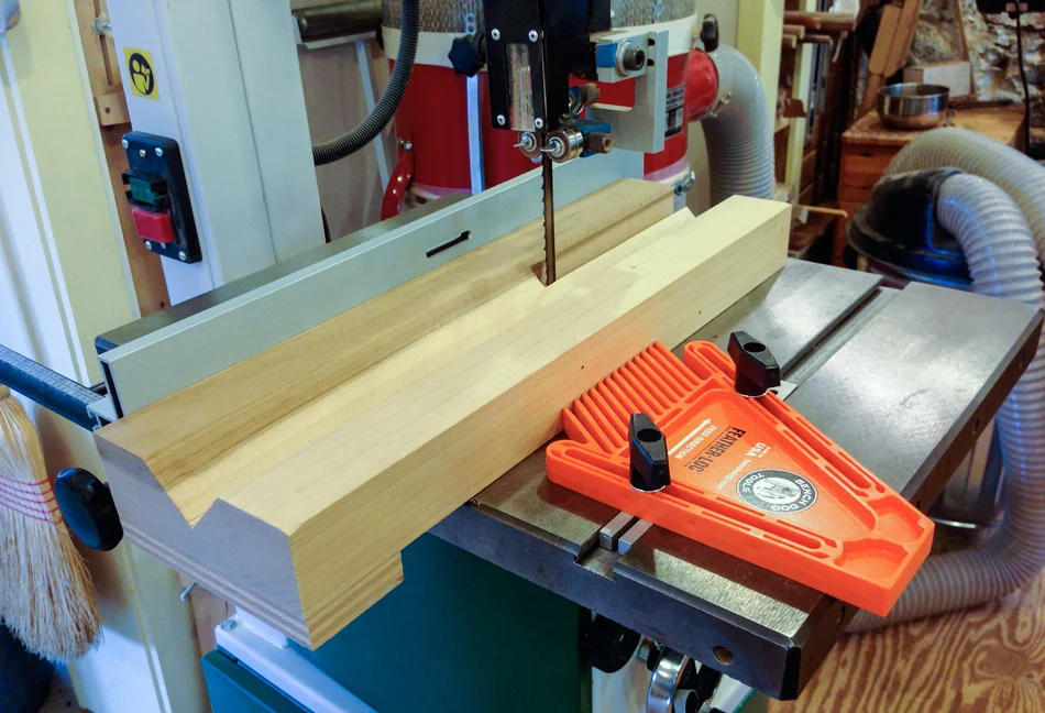 I set the rung blank into the v-block and align the outside edge of the octagon with the bandsaw blade as shown here.