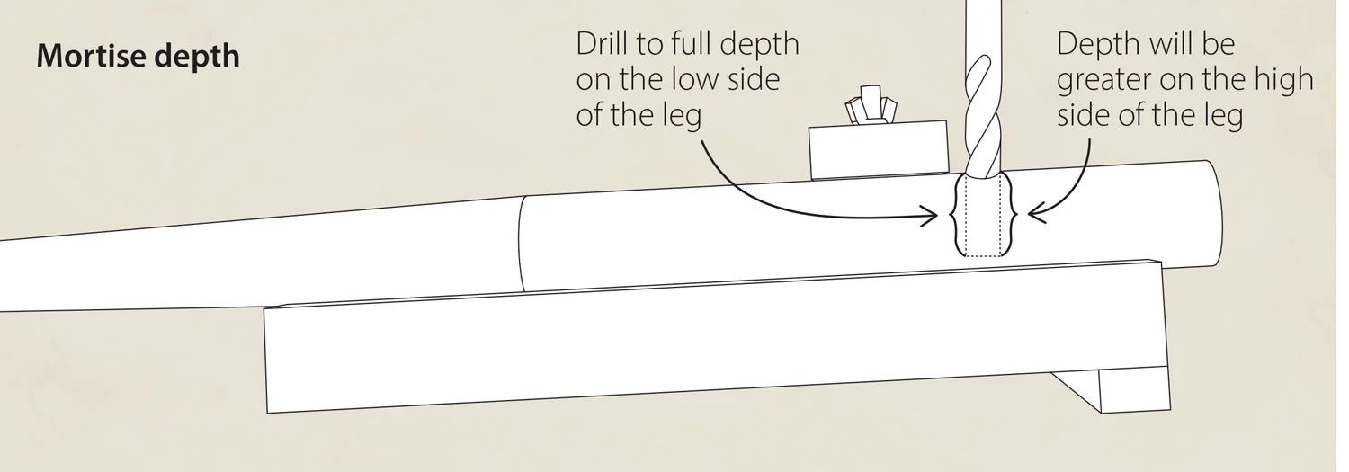 For each mortise I line up the tip of the brad point with the center mark. Next I slowly lower the bit until the mortise is fully scored. Finally I increase the downward speed and drill until the mortise is full depth on the low end of the leg. This ensures a minimum 1-1/4″ mortise depth. When drilling at an angle like this, the depth of the mortise at the high end of the leg will be greater.
